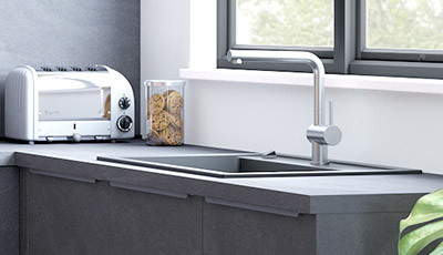 La combinación de gris cemento y el blanco en la parte alta de los muebles impregna esta cocina de un estilo loft precioso. Las líneas de los muebles se delinean con tiradores alargados en acero inoxidable. Los muebles superiores se alzan hasta el techo para sacarles el máximo partido.