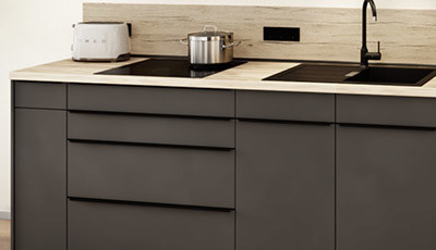 - Tiradores perfilados perfectamente integrados con acabado en cemento negro